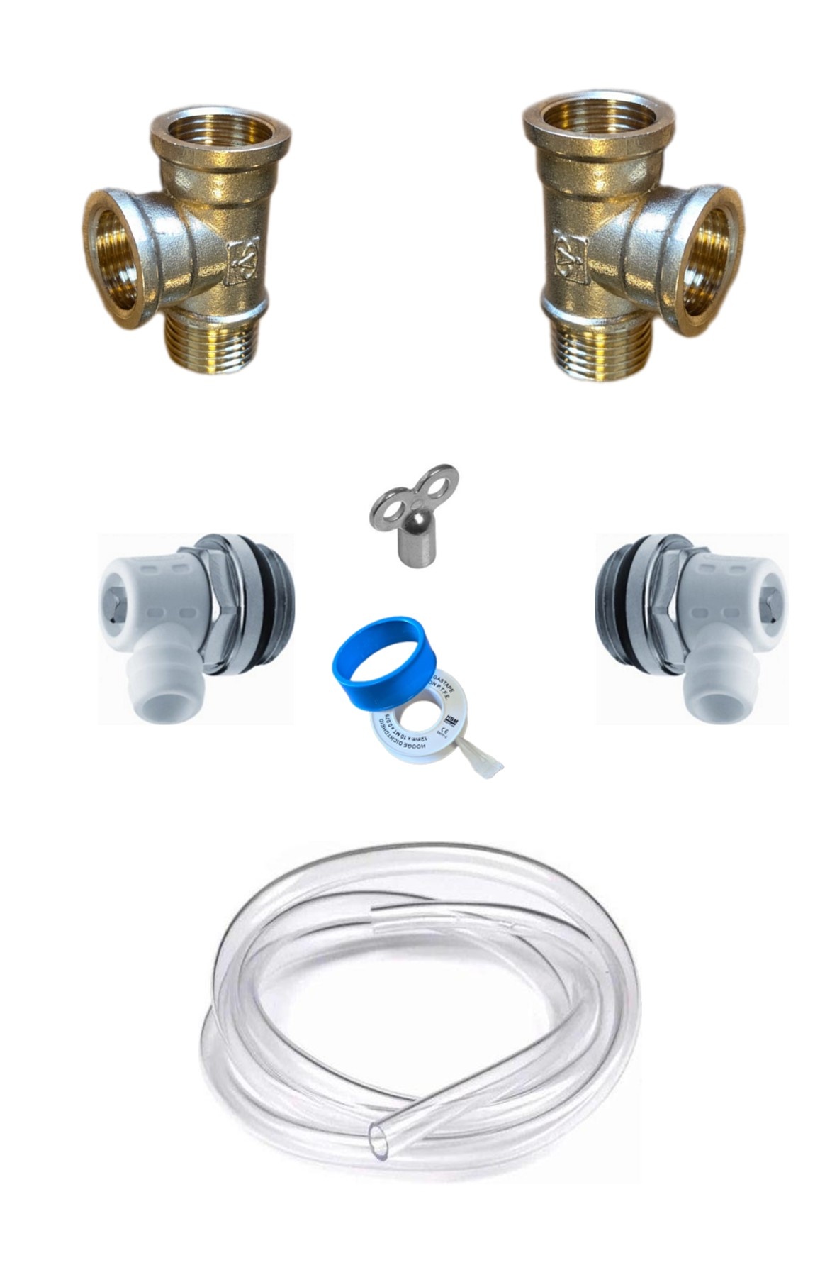 De Boiler Leegloop Set bestaat uit 2 T-stukken 15mm(bnxbnxbt), 2x aftapper, een sleutel en een flexibele slang.