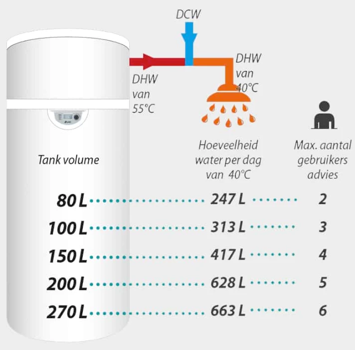Dit model is geschikt voor grote huishoudens van 4 tot 6 personen met intensief warmwatergebruik, zoals gelijktijdig douchen, bad gebruik of meerdere tappunten tegelijk. De 270 liter RVS tank levert bij gebruik op 40°C circa 340 liter bruikbaar warm water.
