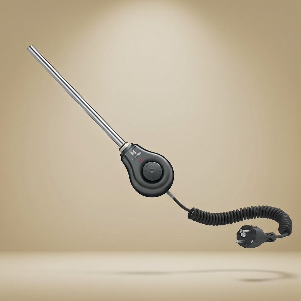 Elektrisch verwarmings element met zowel ruimte sensor en of water temperatuur sensor. Deze mooi vormgegeven elektrische water verwarmer is geschikt voor handdoekradiatoren. De behuizing is volledig zwart