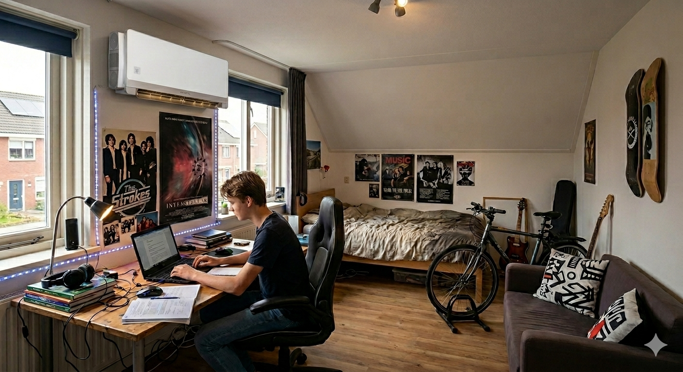 Ja, de Fintek Kyoto is ontworpen als primaire verwarmingsbron voor ruimtes tot 25 m². Dankzij de PTC Booster blijft de unit ook bij vriestemperaturen buiten functioneren en houdt hij de binnentemperatuur boven de 20°C. In een goed geïsoleerde slaapkamer of studio is de Kyoto daarmee toereikend als enige verwarming.