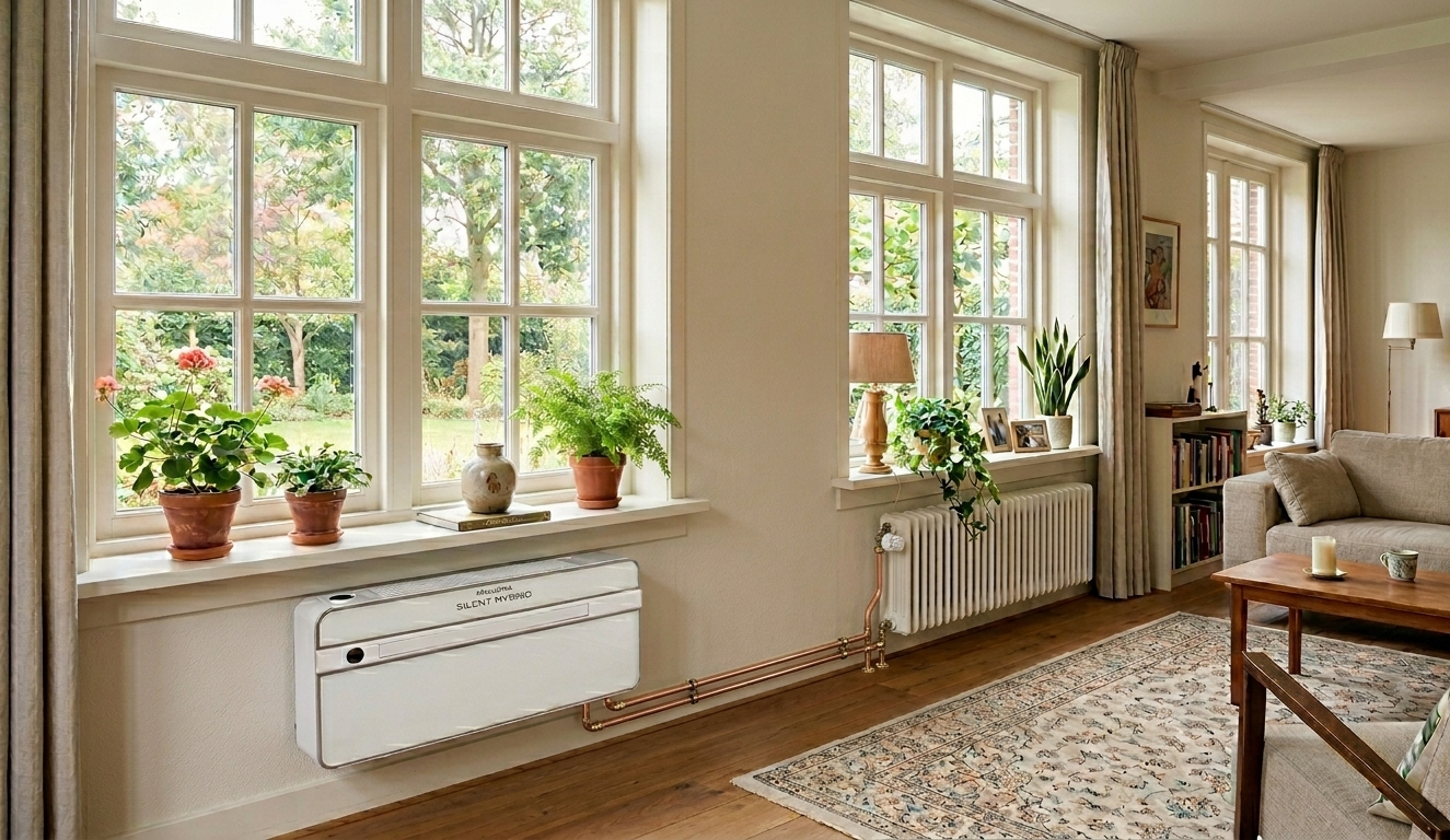 Ja, de Fintek Panama is juist ontwikkeld voor situaties waarin een buitenunit niet geplaatst mag of kan worden. Doordat aan de gevel uitsluitend twee kleine, overschilderbare roosters zichtbaar zijn, voldoet de installatie in veel gevallen aan de eisen van VvE-besturen en welstandscommissies waar een split-systeem zou worden afgekeurd.