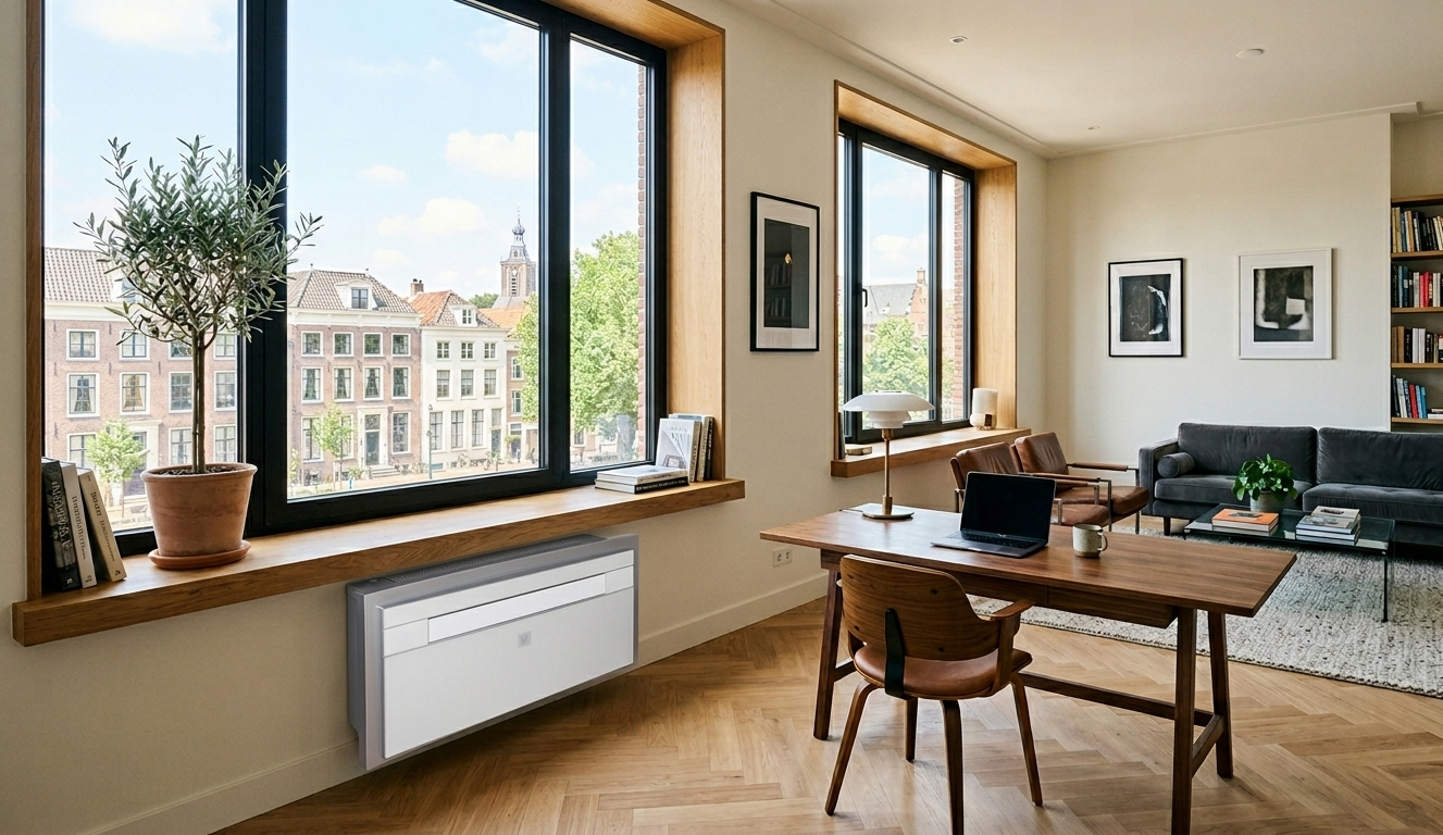 Het grootste praktische voordeel is dat er geen buitenunit nodig is. Voor bewoners van appartementen met VvE-regels, eigenaren van monumentale panden of woningen in een beschermd stadsgezicht biedt dit een vaste en nette installatie zonder gevelaanpassing. Anders dan een mobiele airco hoeft er geen raam open te staan, wat het systeem stiller en efficiënter maakt.