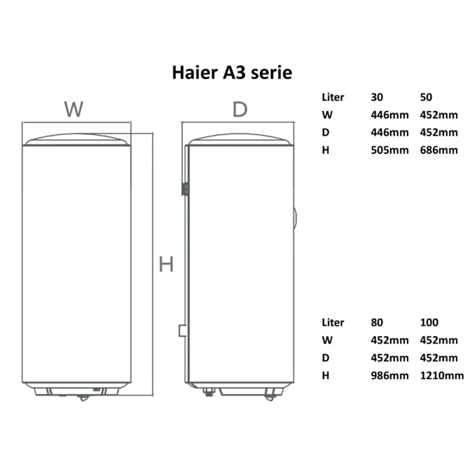De Haier elektrische boiler type A3 serie is ontworpen voor wie gewoon elke dag zonder gedoe warm water wil. Deze verticale boilers zijn beschikbaar in 30, 50, 80 en 100 liter en leveren precies de hoeveelheid warm water die je nodig hebt, of je nu alleen woont of met een gezin. Dankzij het zuinige 1500 W vermogen en de slimme veiligheidsfuncties is de A3 serie een toegankelijke keuze voor vrijwel ieder huis.