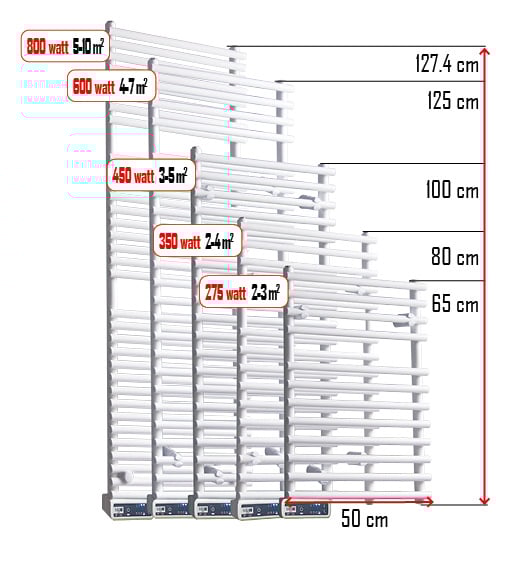 450 watt (1000 mm hoog) en 600 watt (1250 mm hoog) voor middelgrote tot grotere badkamers