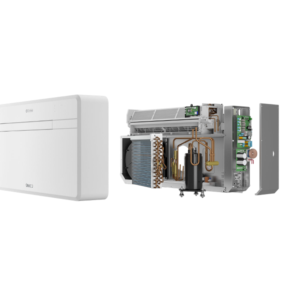 De Unico Next bevat alle techniek in één binnenunit. Via twee wanddoorvoeren wordt lucht aan- en afgevoerd. De warmtepomp verplaatst warmte: naar buiten bij koelen en naar binnen bij verwarmen.