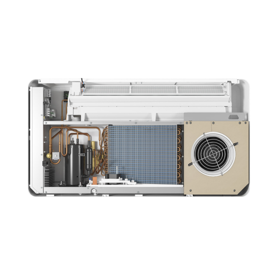 Alle techniek zit in één unit. Via twee muurdoorvoeren wordt lucht aan- en afgevoerd. De warmtepomp verplaatst warmte: naar buiten bij koelen en naar binnen bij verwarmen. Door de lage koudemiddelvulling van 0,145 kg is installatie zonder certificaat toegestaan.